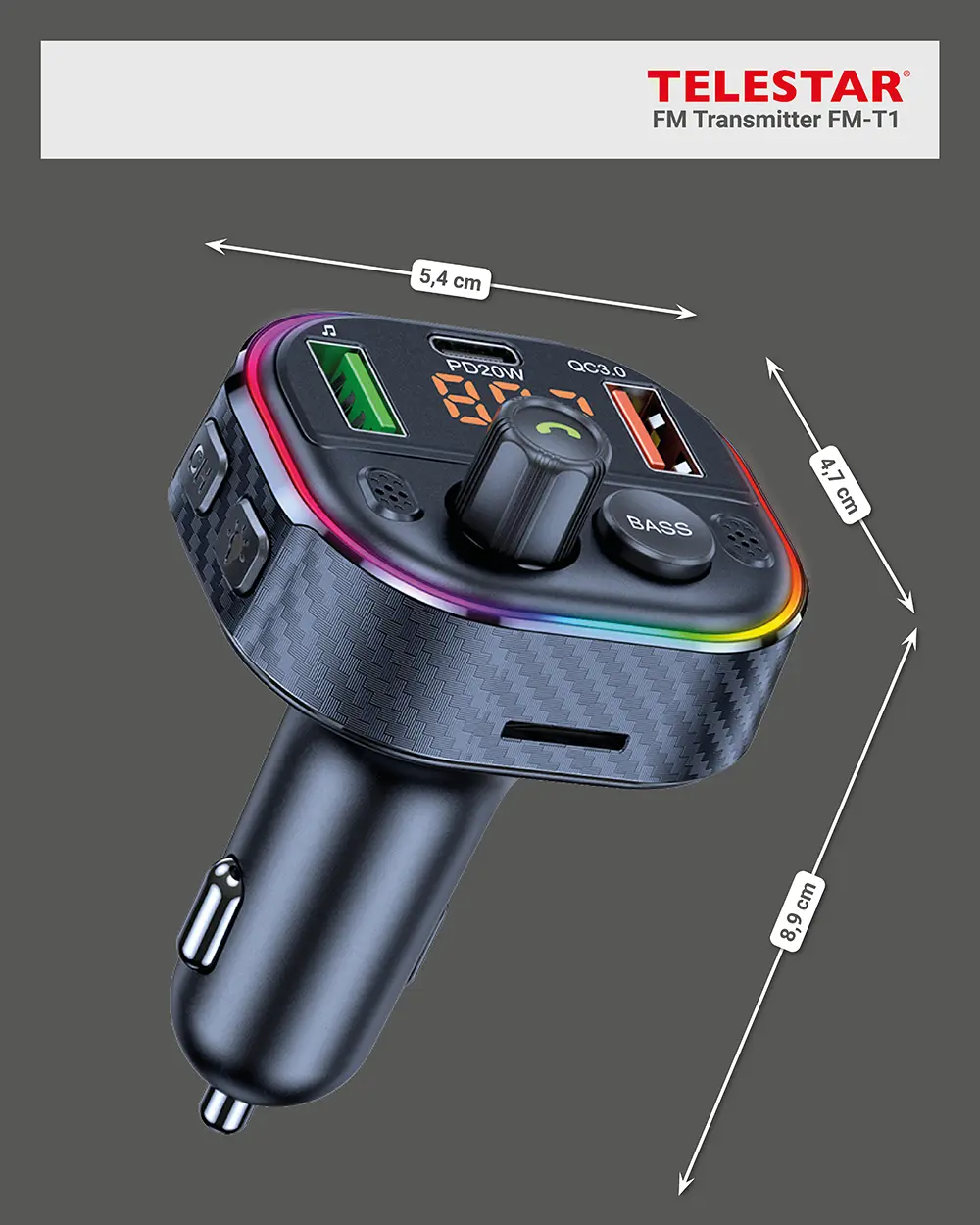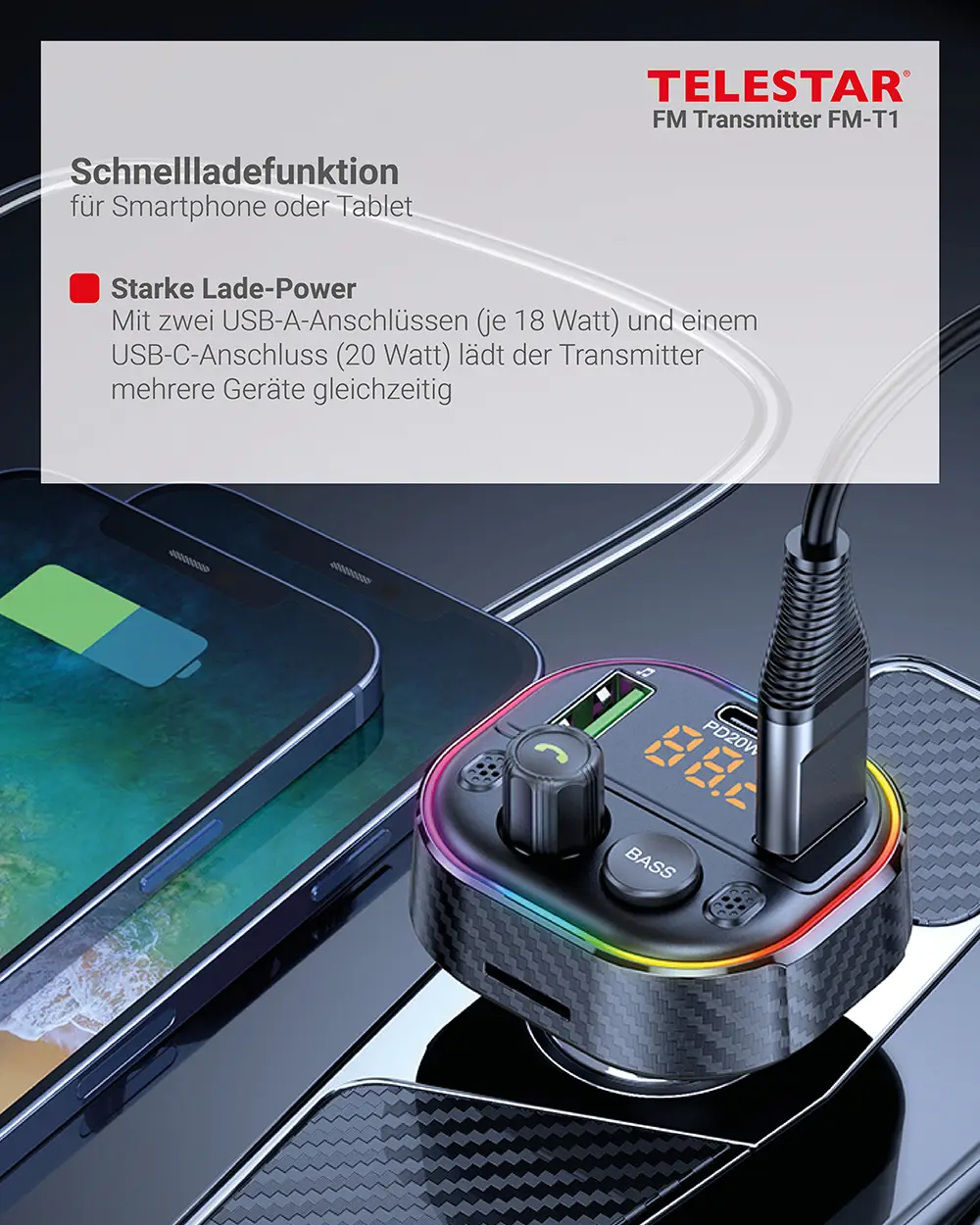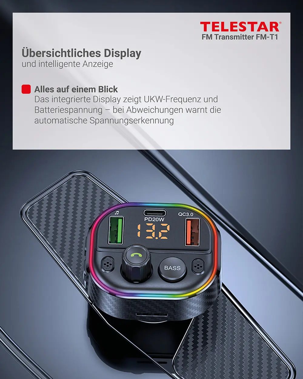 Neben der Audiofunktion überzeugt der FM-Transmitter mit leistungsstarken Ladeoptionen: Zwei USB-A-Anschlüsse mit je 18 Watt (Quick Charge) sowie ein USB-C-Port mit 20 Watt (Power Delivery) laden Smartphones, Tablets oder Navis schnell und sicher. Das übersichtliche Display zeigt nicht nur die gewählte Frequenz, sondern auch die Bordspannung, inklusive Warnhinweis bei kritischen Werten. Abgerundet wird das Gerät durch eine einstellbare, mehrfarbige LED-Ambientebeleuchtung, die für ein modernes Erscheinungsbild und gute Sichtbarkeit bei Nacht sorgt.