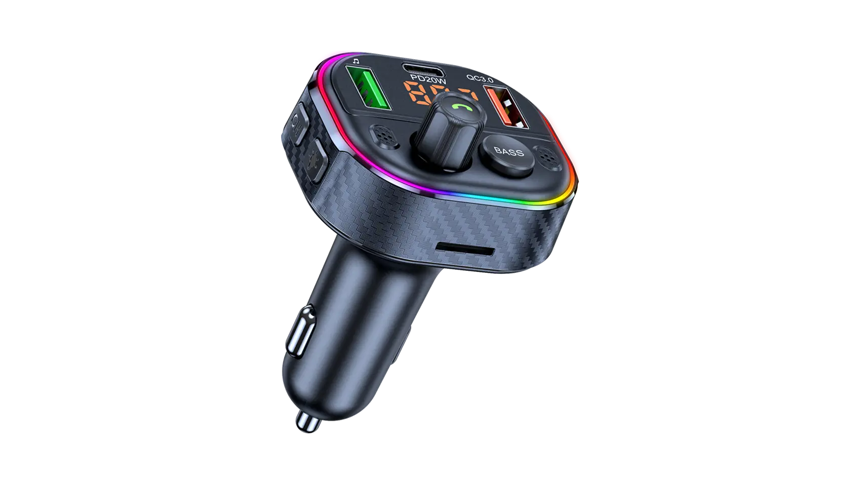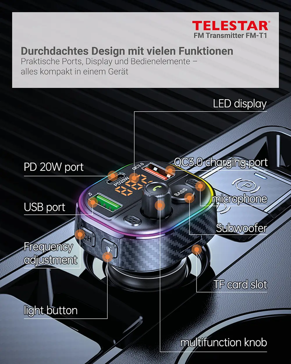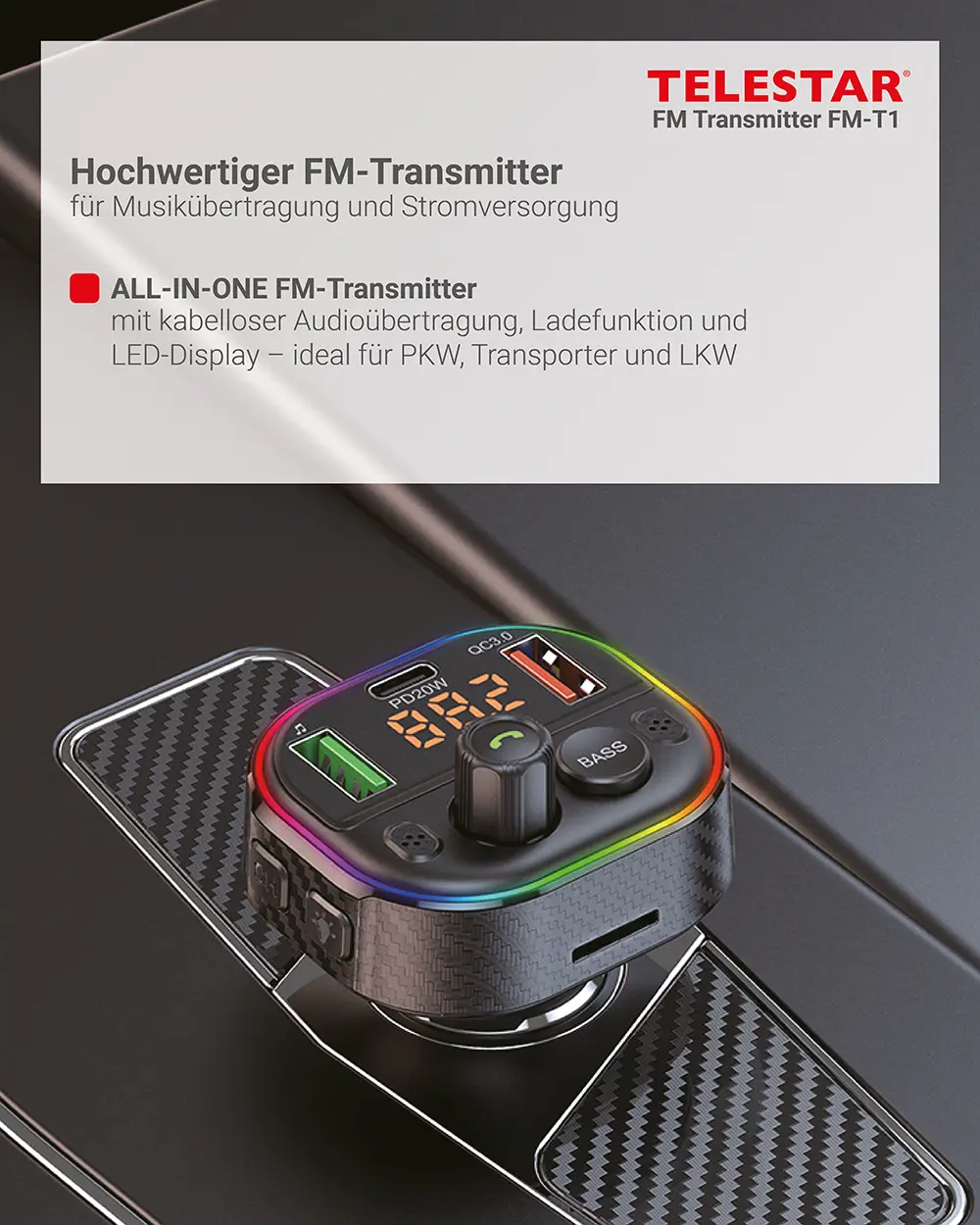 Neben der Audiofunktion überzeugt der FM-Transmitter mit leistungsstarken Ladeoptionen: Zwei USB-A-Anschlüsse mit je 18 Watt (Quick Charge) sowie ein USB-C-Port mit 20 Watt (Power Delivery) laden Smartphones, Tablets oder Navis schnell und sicher. Das übersichtliche Display zeigt nicht nur die gewählte Frequenz, sondern auch die Bordspannung, inklusive Warnhinweis bei kritischen Werten. Abgerundet wird das Gerät durch eine einstellbare, mehrfarbige LED-Ambientebeleuchtung, die für ein modernes Erscheinungsbild und gute Sichtbarkeit bei Nacht sorgt.