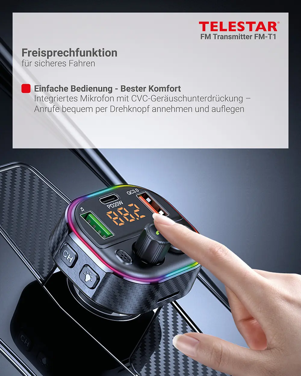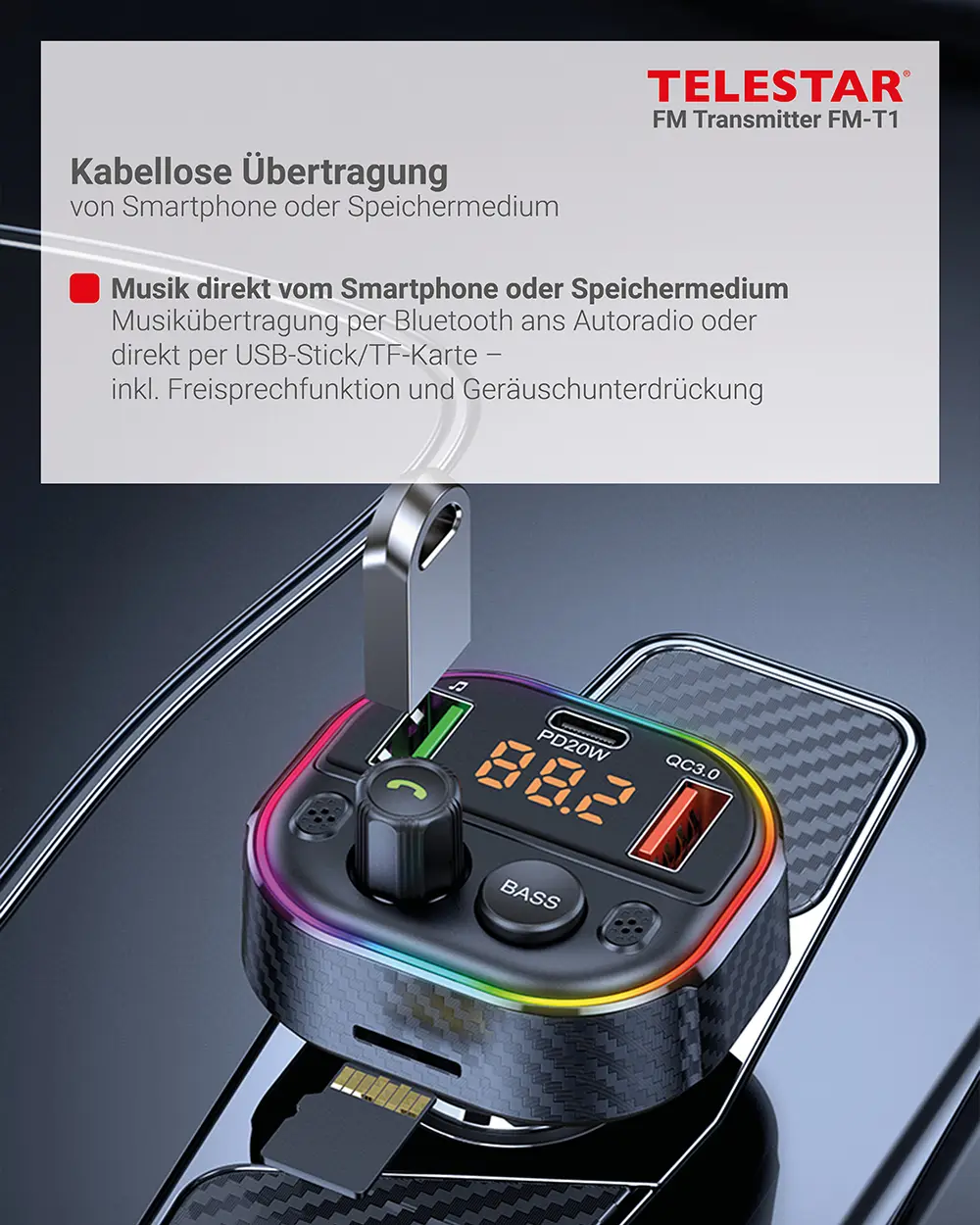 Musik lässt sich kabellos per Bluetooth vom Smartphone an den FM-Transmitter senden und über eine freie UKW-Frequenz abspielen. Alternativ können auch USB-Sticks oder TF-Karten genutzt werden, wobei die Formate MP3, WMA und WAV unterstützt werden. Der Transmitter merkt sich die letzte Einstellung selbst nach einem Stromausfall. Für Telefonate sorgt das integrierte Mikrofon mit CVC-Geräuschunterdrückung für klare Sprachqualität und bietet bei Bedarf eine Umschaltung in den Privatmodus.