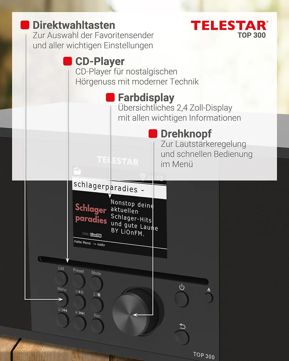 Ein individuell programmierbarer Nachtmodus sorgt für hohen Bedienkomfort, indem das Display automatisch zu definierten Zeiten ein- und ausgeschaltet wird. Zwei integrierte Lautsprecher mit jeweils 15 Watt Musikleistung liefern einen ausgewogenen und kraftvollen Stereo-Klang. Das TOP 300 eignet sich ideal für alle, die modernes Digitalradio, Streamingfunktionen und CD-Wiedergabe in einem Gerät kombinieren möchten.