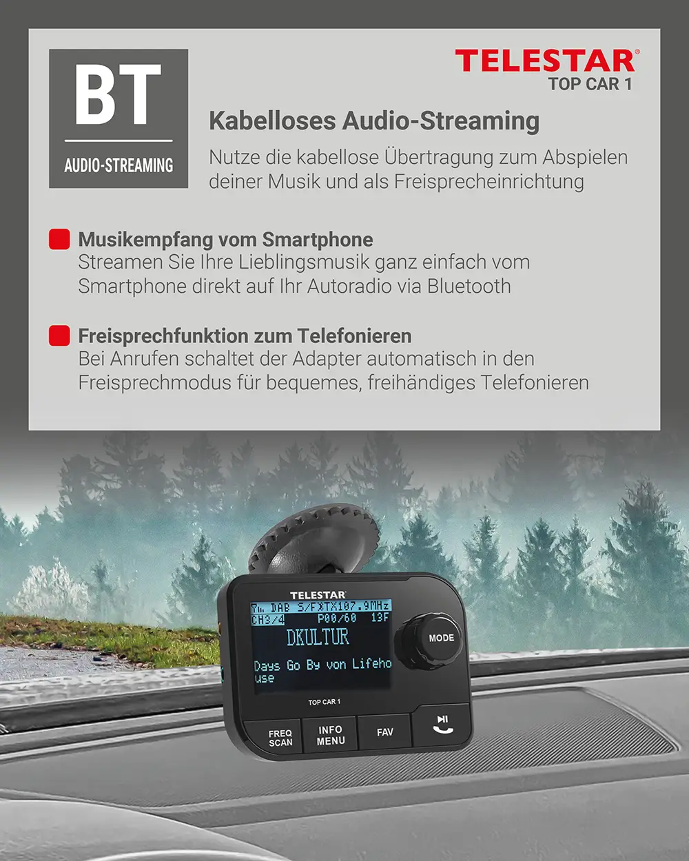 Die einfache Installation per Saugnapf sowie selbstklebenden Kabelclips sorgt für eine schnelle und saubere Montage im Fahrzeug. Damit ist der TOP CAR 1 die ideale Lösung für alle, die ihr Auto unkompliziert mit DAB+ Digitalradio und Bluetooth-Streaming ausstatten möchten.
