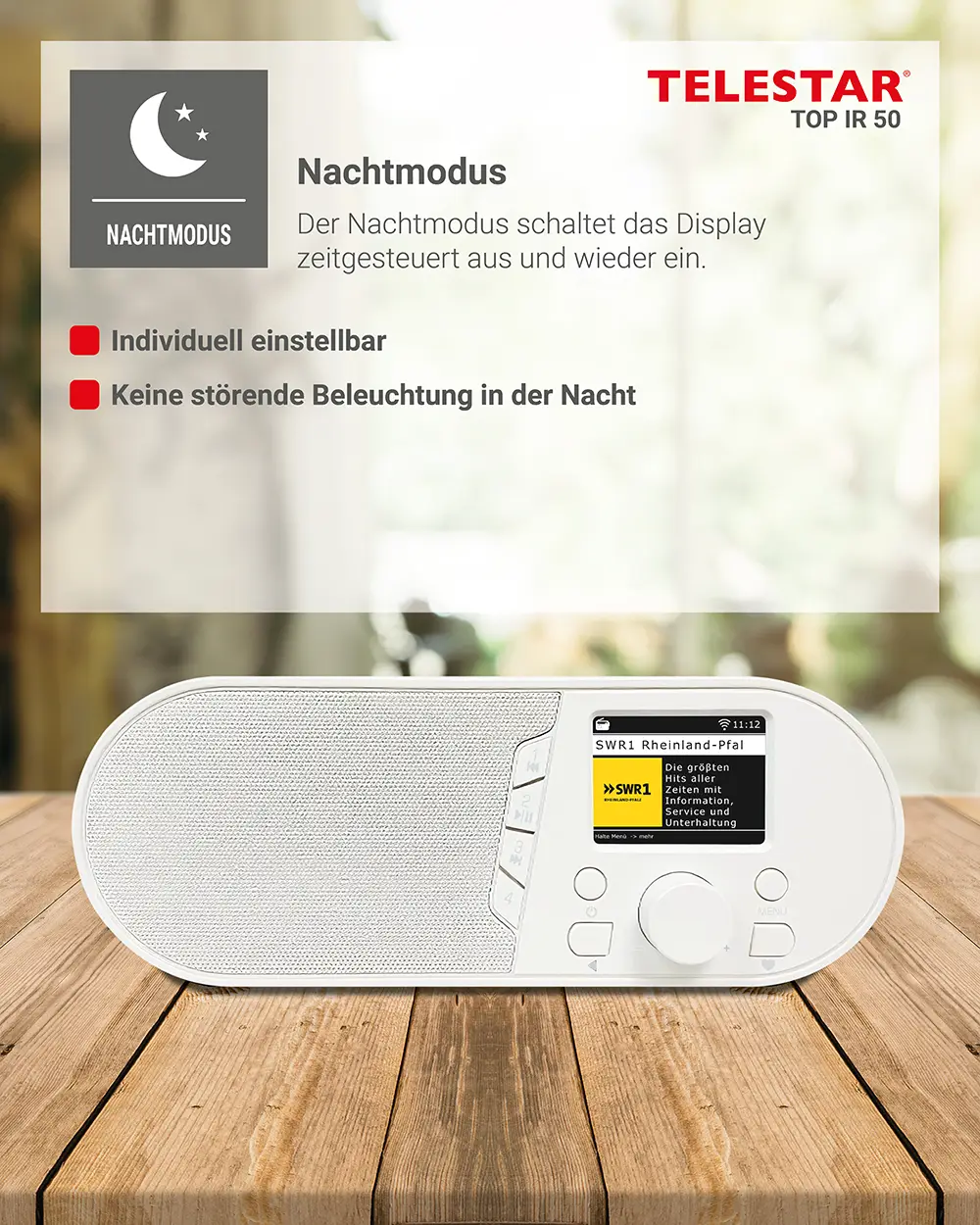 Ein programmierbarer Nachtmodus sorgt für angenehmen Bedienkomfort, indem das Display automatisch zu definierten Zeiten aus- und wieder eingeschaltet wird. Im Hotelmodus lassen sich die Menüs per PIN schützen und die maximale Lautstärke begrenzen, was das Gerät ideal für den Einsatz in Gästezimmern macht. Ein integrierter Lautsprecher mit 7 Watt Musikleistung liefert einen klaren und ausgewogenen Klang. Abgerundet wird das Funktionspaket durch die Anzeige lokaler Wetterinformationen auf dem Display.