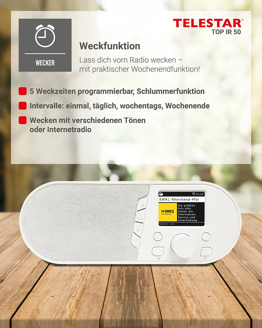 - Wecker und Sleeptimer mit unterschiedlichen Modi