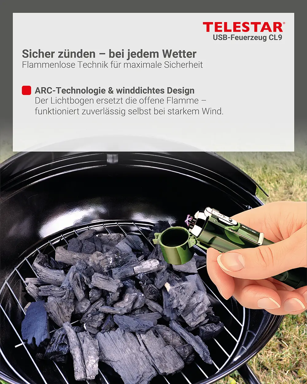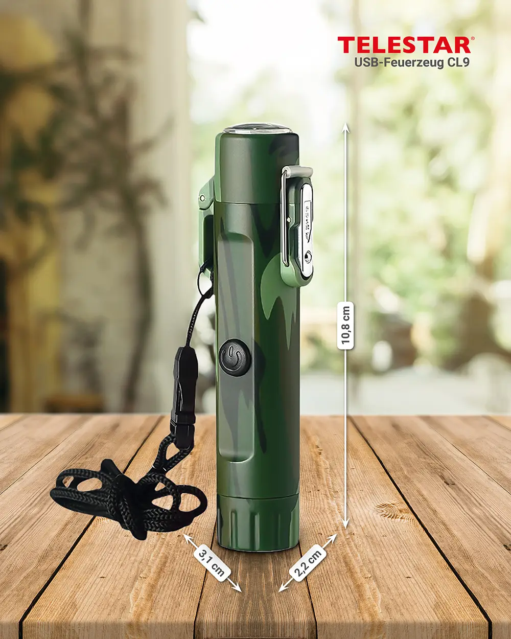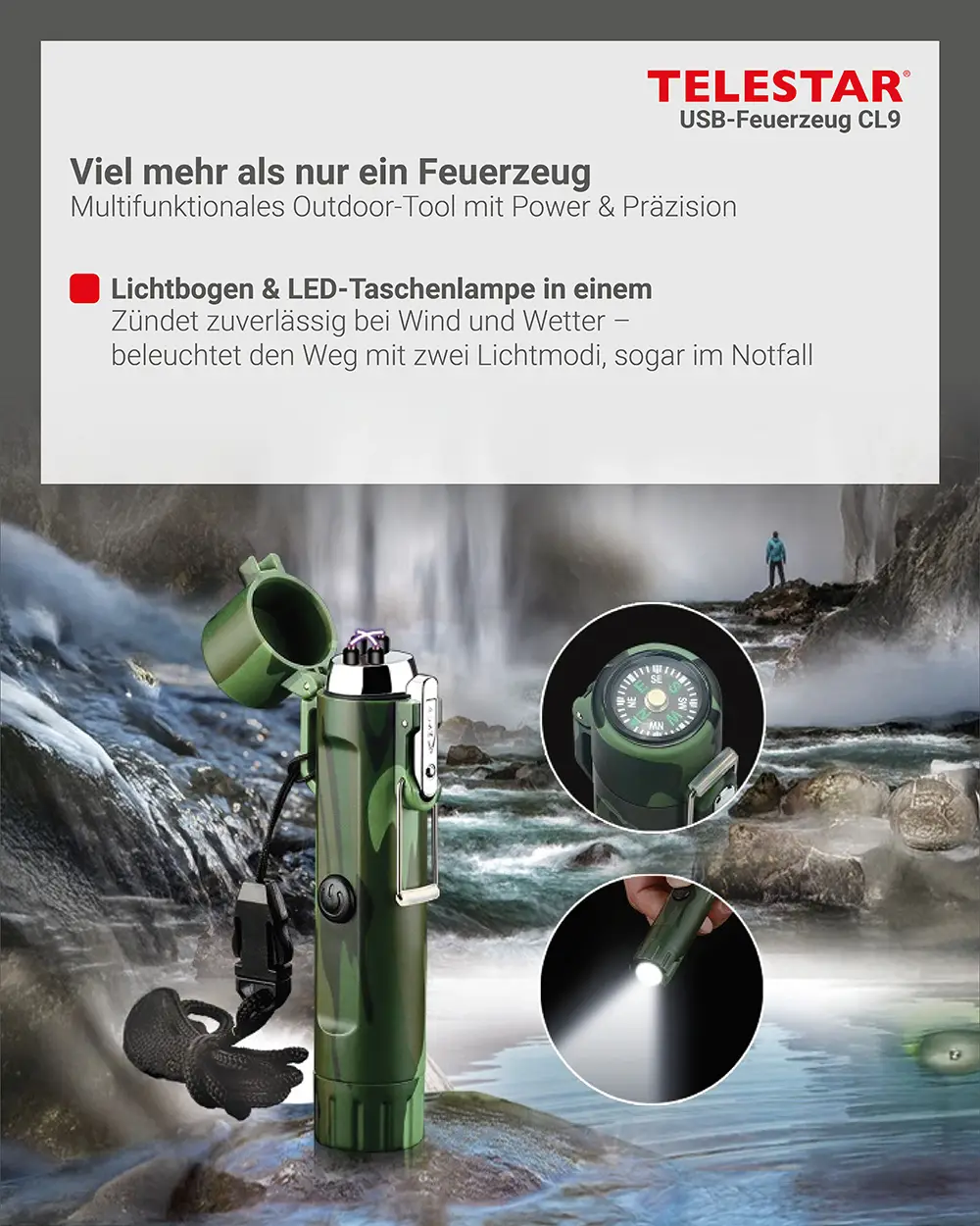 Dank des stabilen Gehäuses aus Zinklegierung und ABS-Kunststoff ist das USB-Feuerzeug CL9 bestens gegen Stöße, Kratzer und Witterungseinflüsse geschützt. Die Schutzklasse IP56 macht es widerstandsfähig gegen Regen und Staub. Ein integrierter Kompass unterstützt zusätzlich bei der Orientierung im Gelände und macht das Feuerzeug zum praktischen Begleiter für Wanderungen, Trekkingtouren oder Reisen.