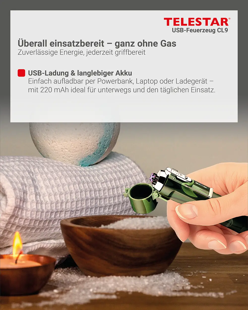 Neben der Lichtbogen-Funktion verfügt das USB-Feuerzeug über eine integrierte Taschenlampe mit drei Modi: helles Dauerlicht, gedimmte Beleuchtung sowie ein SOS-Blinklicht für Notfälle. Der eingebaute 220-mAh-Akku liefert ausreichend Energie für zahlreiche Einsätze und lässt sich flexibel über Powerbank, Ladegerät oder Computer aufladen. So ist das USB-Feuerzeug CL9 jederzeit einsatzbereit – drinnen wie draußen.