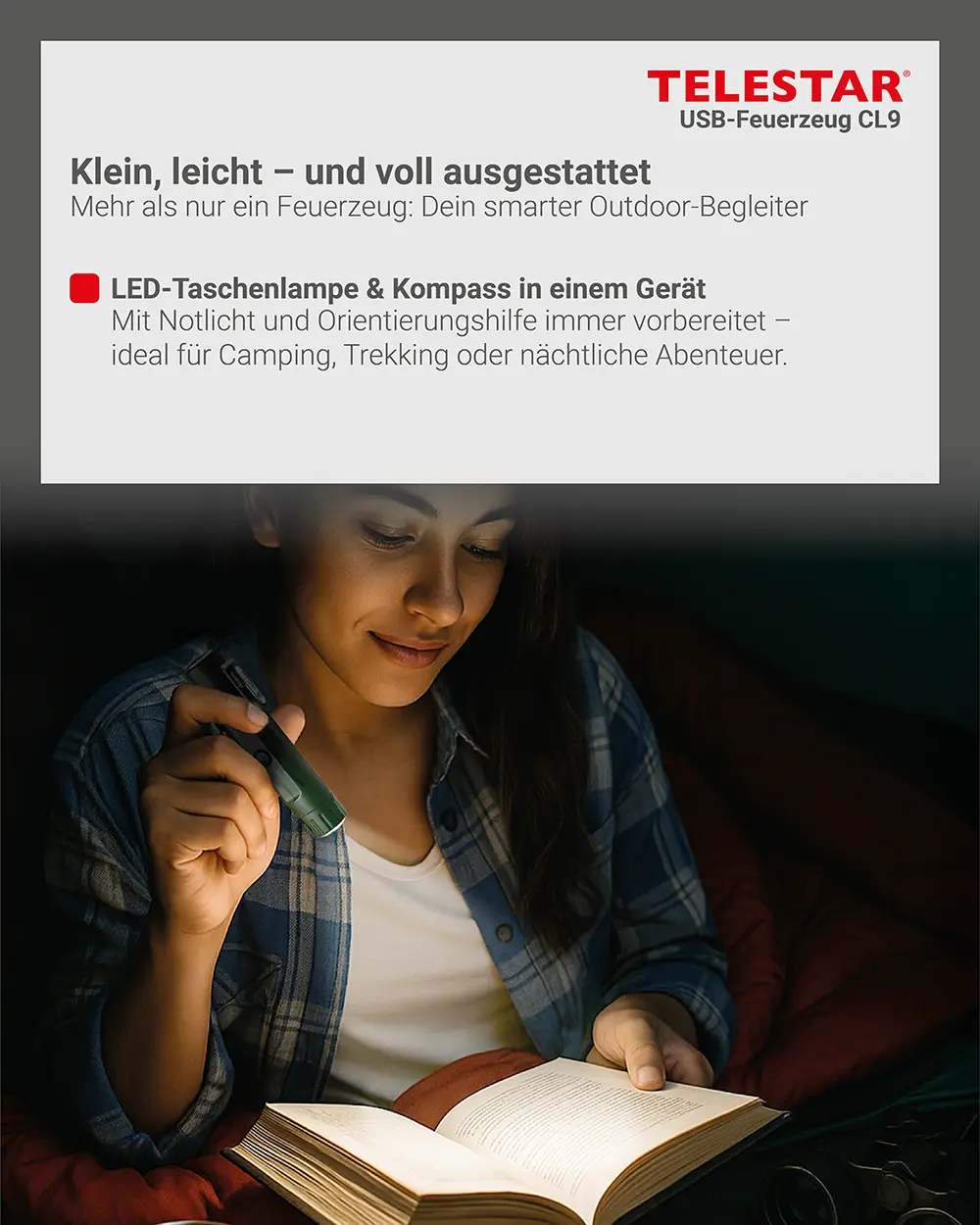 - Taschenlampenfunktion mit drei Betriebsmodi (normales, gedimmtes und SOS-Blinklicht)